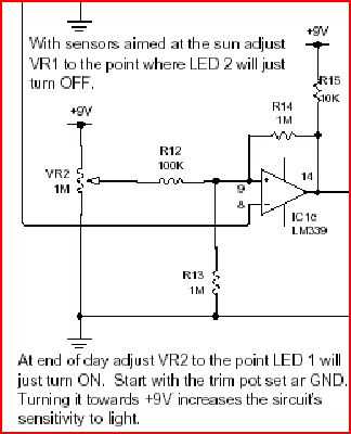 4) Construct the portion of the solar tracker circuit (shown above) on your project board. Build the circuit so that the physical circuit looks as much like the schematic drawing as possible. Explain your circuit to your lab instructor so he/she can verify that you have constructed it correctly.
